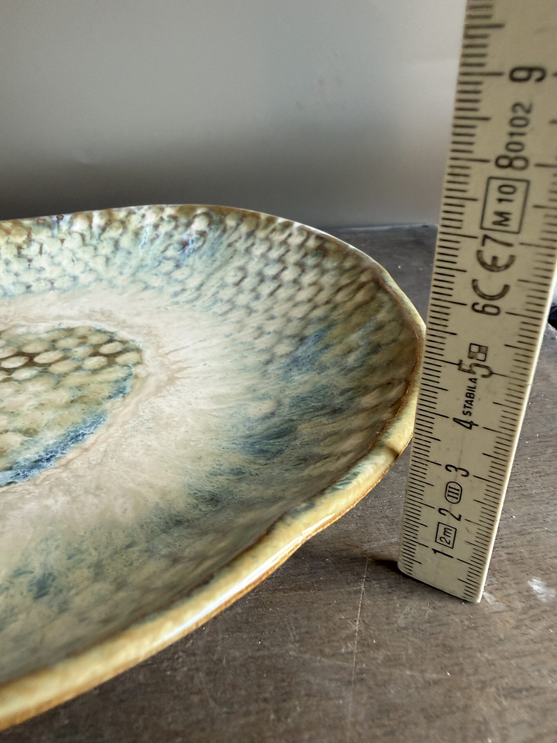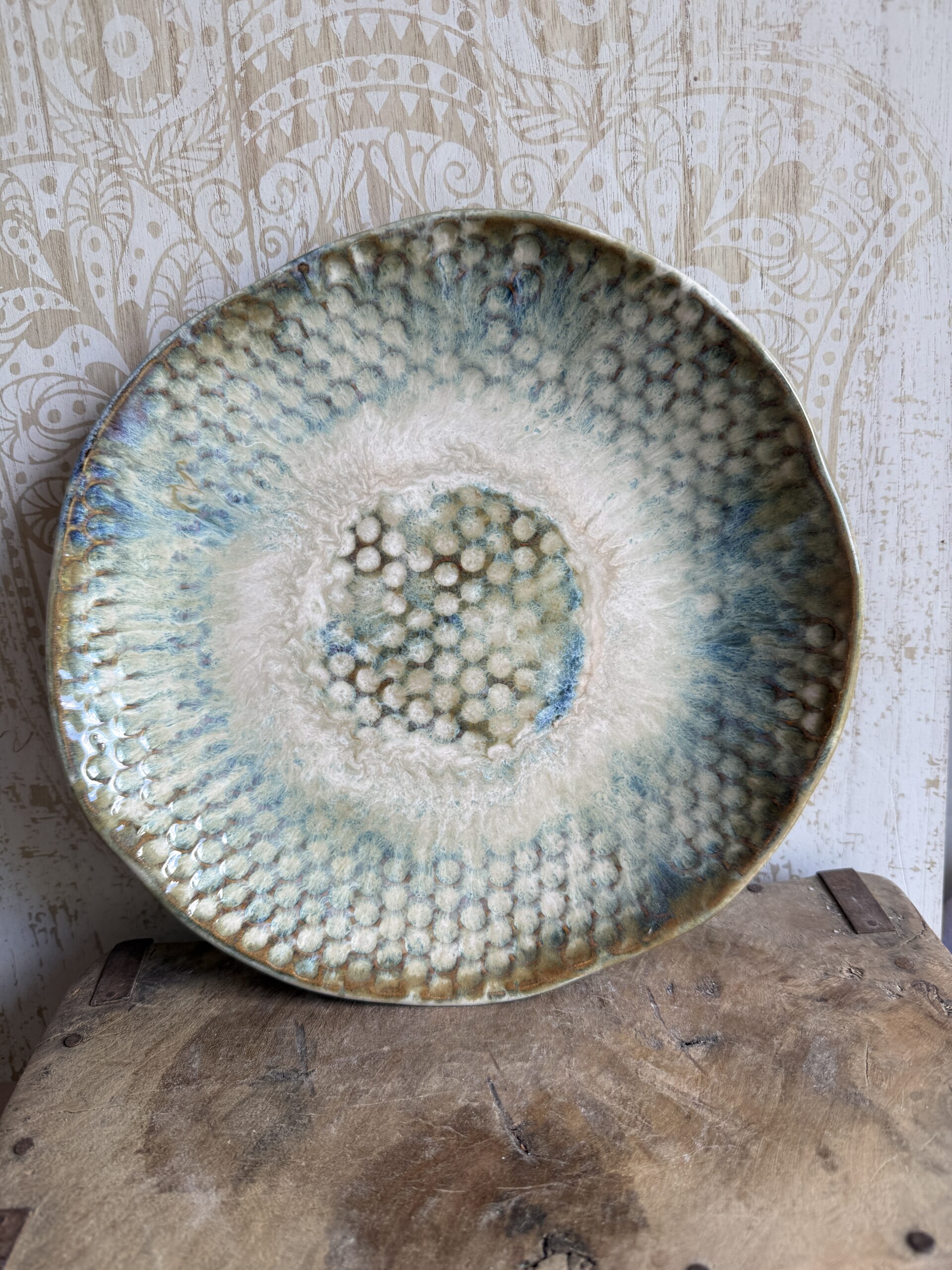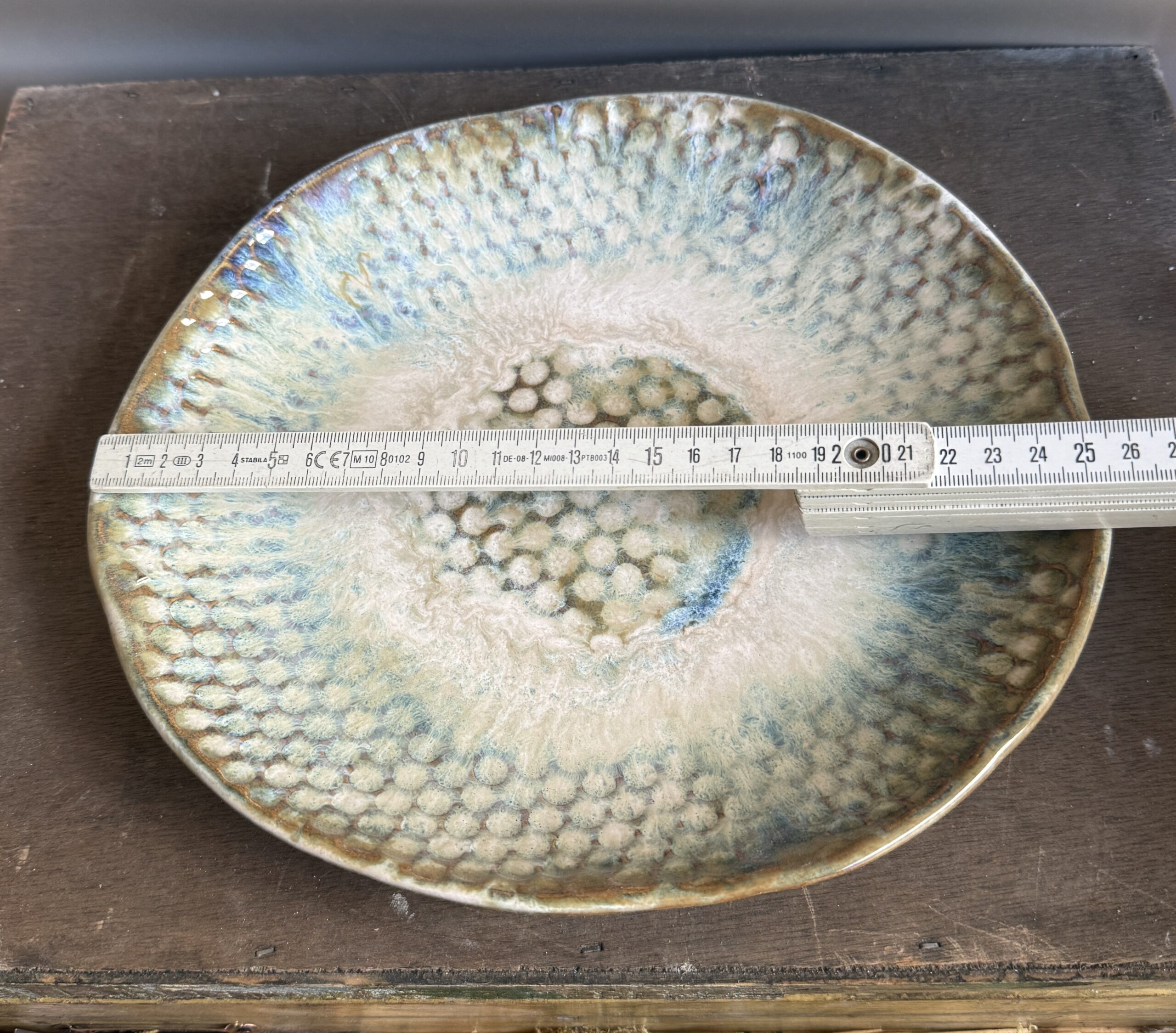 Das Besondere an dieser Schale ist ihr außergewöhnliches Waben- bzw. Blasenmuster, das der Oberfläche eine faszinierende Struktur verleiht. In Kombination mit den Glasuren in Weiß, Bernstein und zarten Blaunuancen entstehen einzigartige Farbverläufe, die je nach Lichteinfall lebendig wirken und der Schale eine magische Tiefe schenken. So entsteht ein Stück, das nicht nur als Dekoration dient, sondern als echtes Statement-Piece im Raum wirkt.