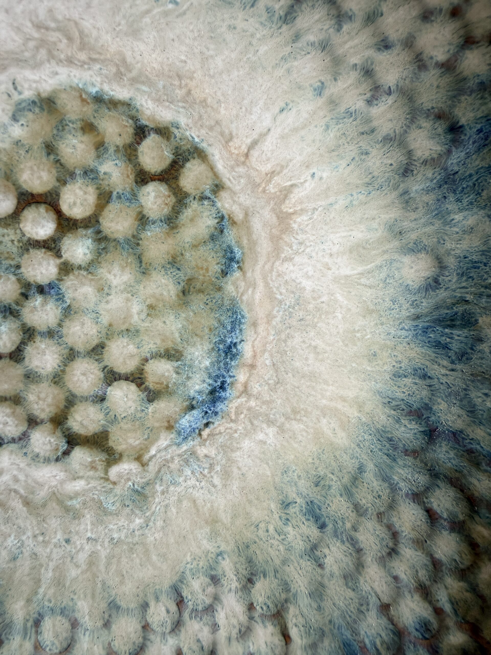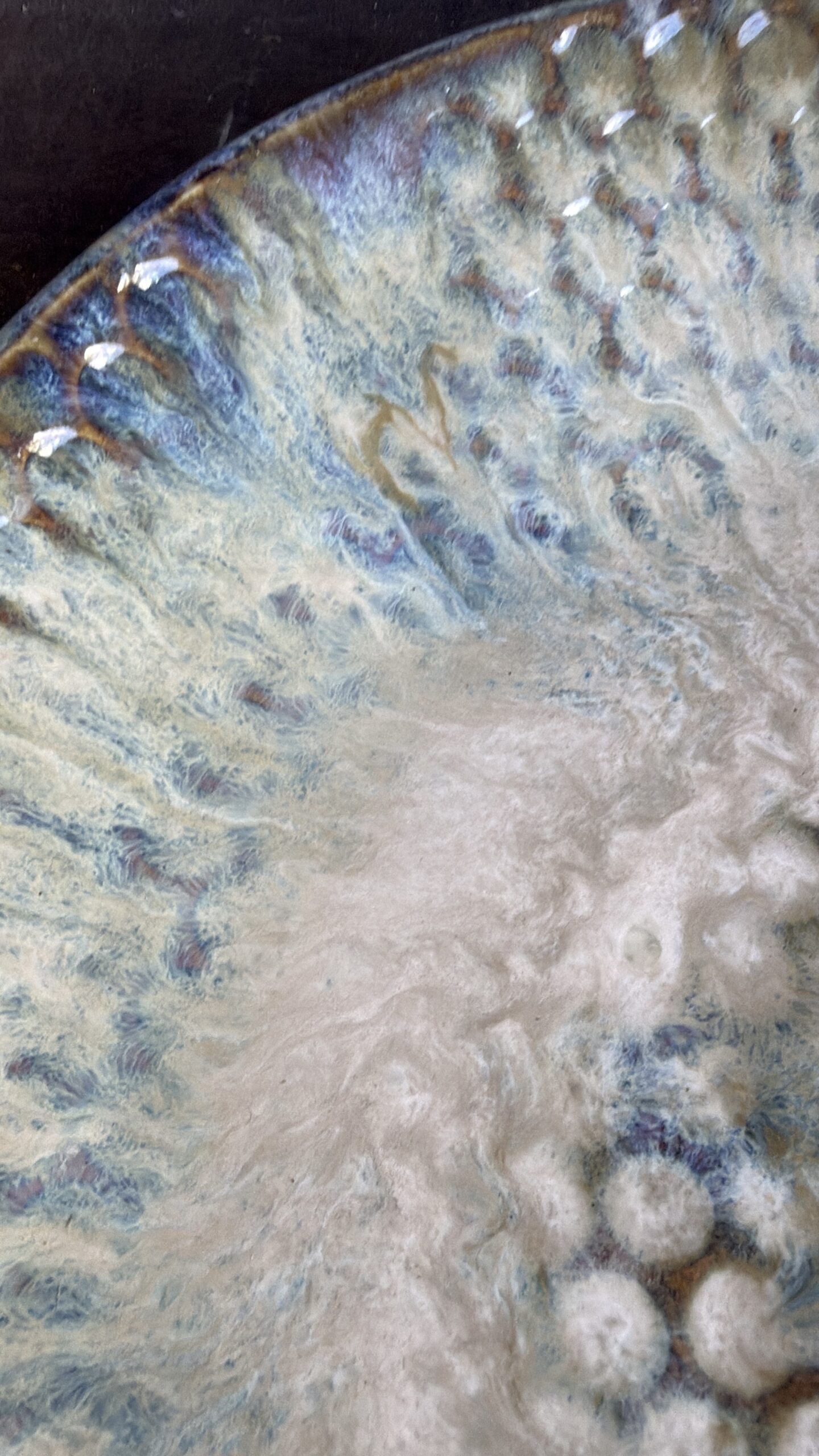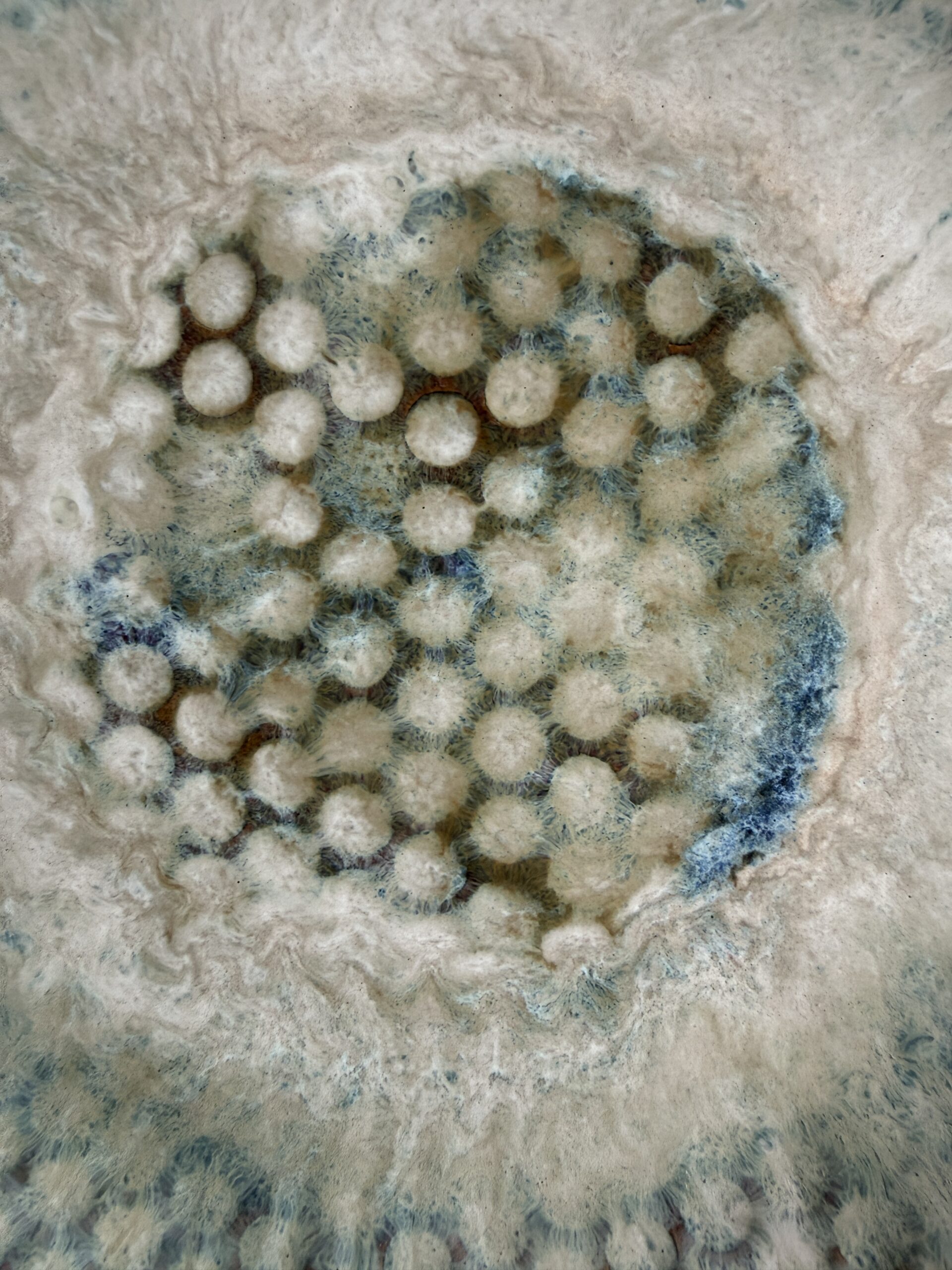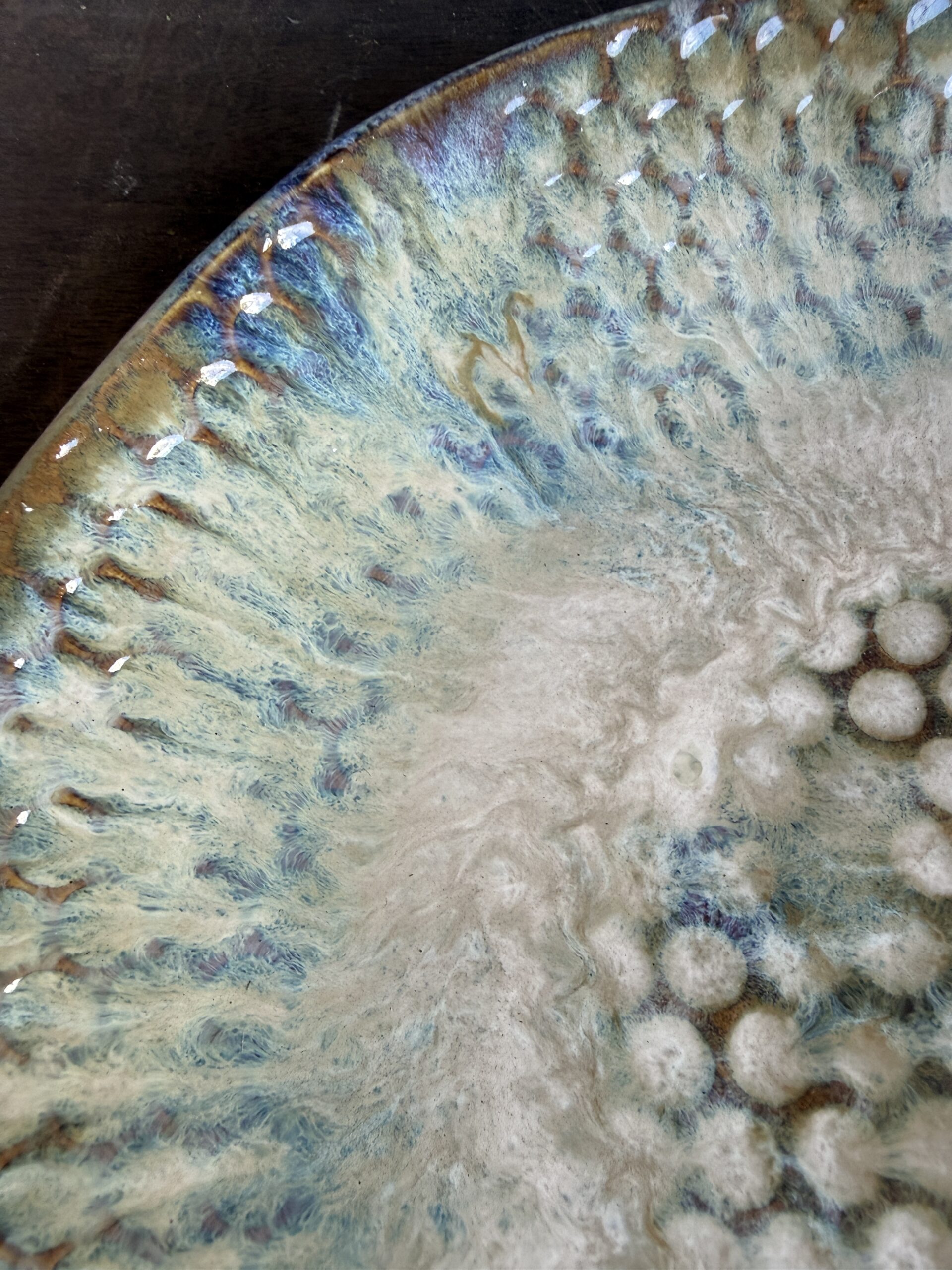 Das Besondere an dieser Schale ist ihr außergewöhnliches Waben- bzw. Blasenmuster, das der Oberfläche eine faszinierende Struktur verleiht. In Kombination mit den Glasuren in Weiß, Bernstein und zarten Blaunuancen entstehen einzigartige Farbverläufe, die je nach Lichteinfall lebendig wirken und der Schale eine magische Tiefe schenken. So entsteht ein Stück, das nicht nur als Dekoration dient, sondern als echtes Statement-Piece im Raum wirkt.