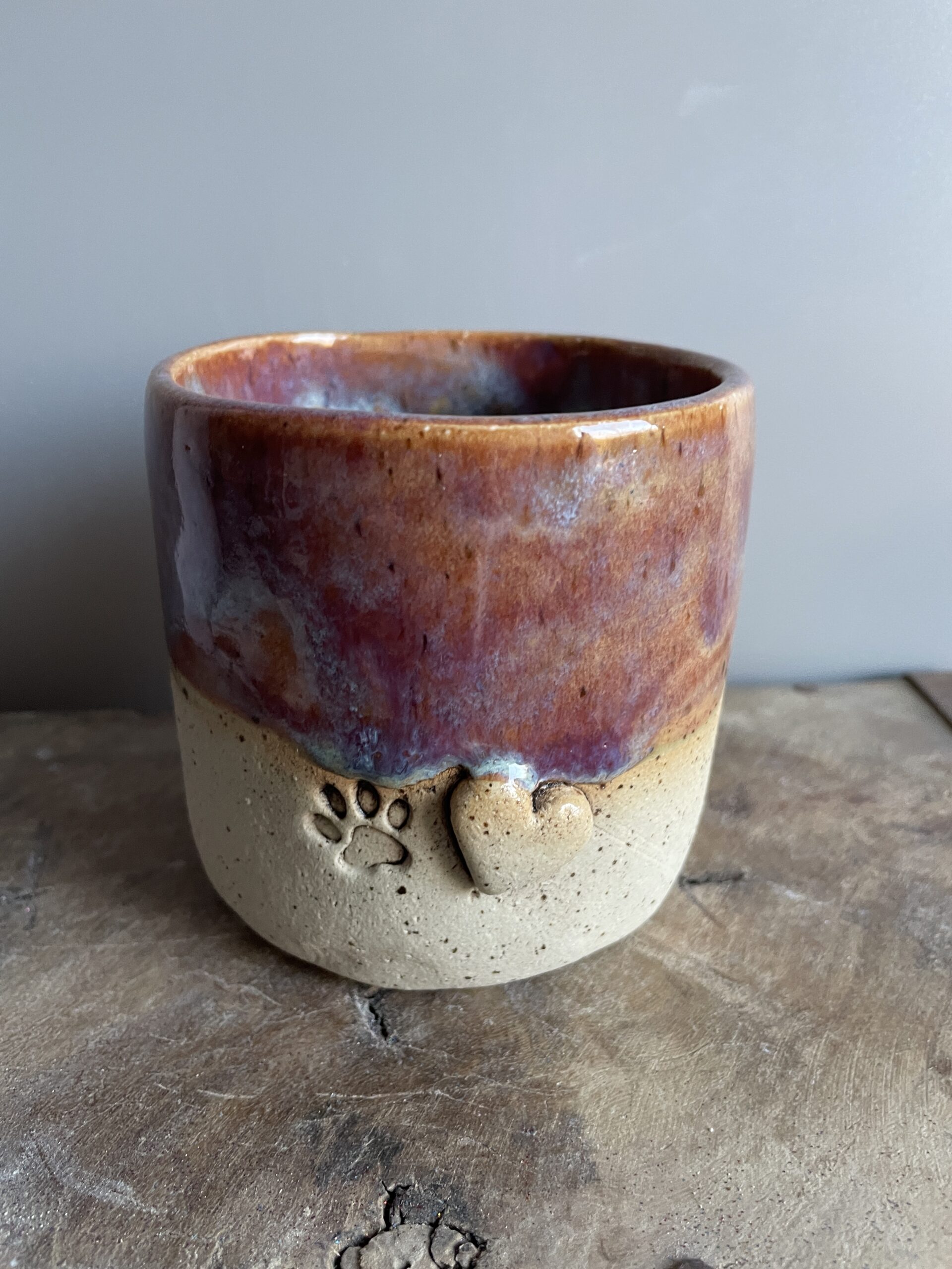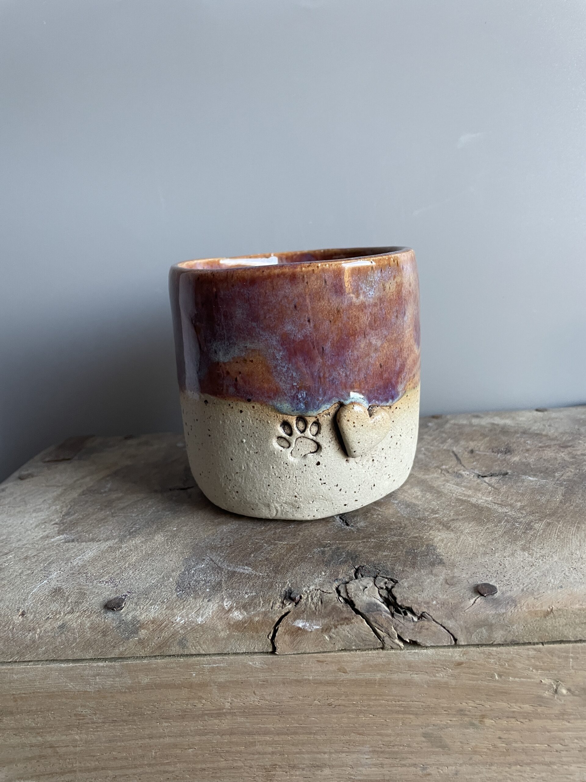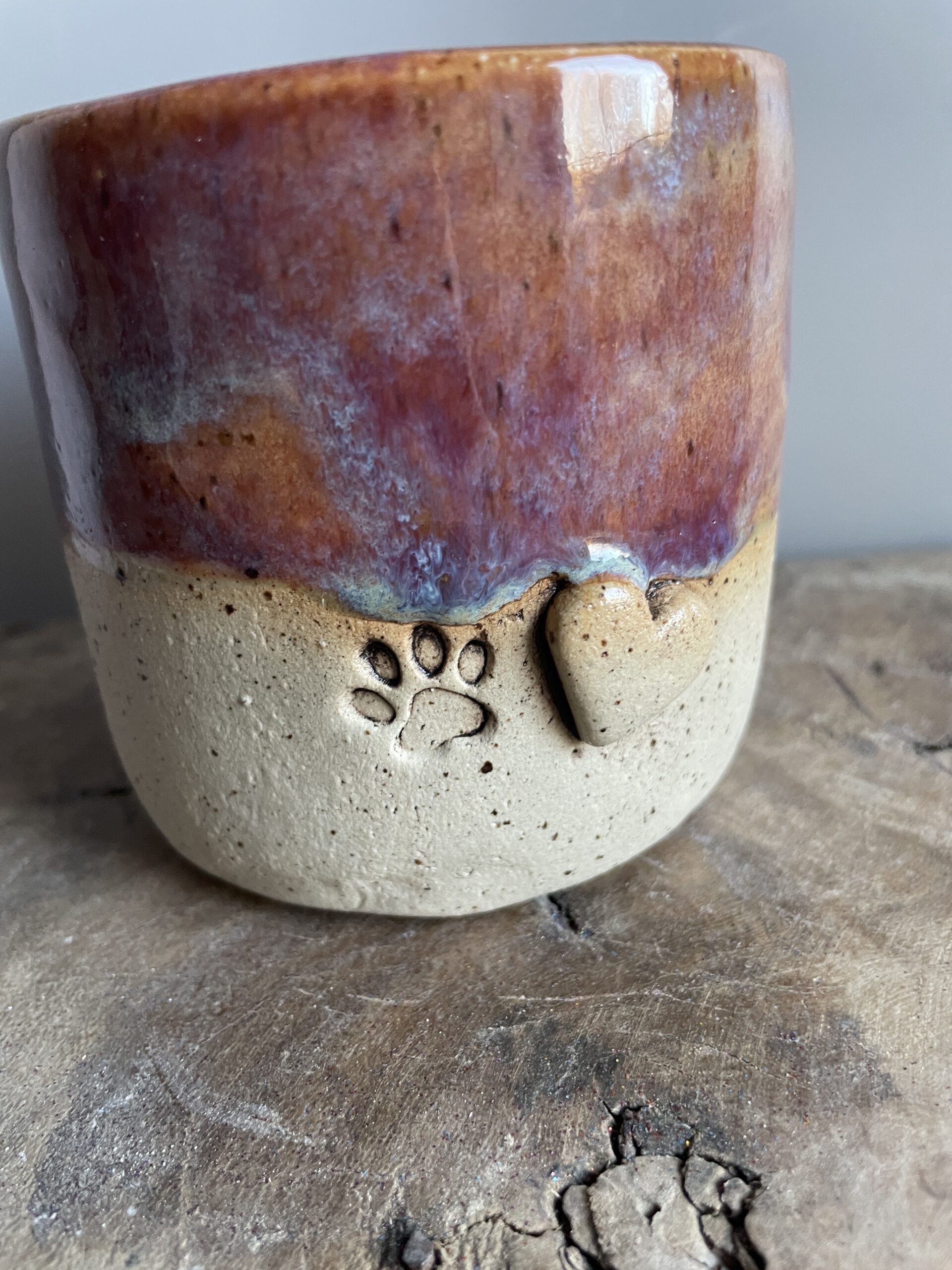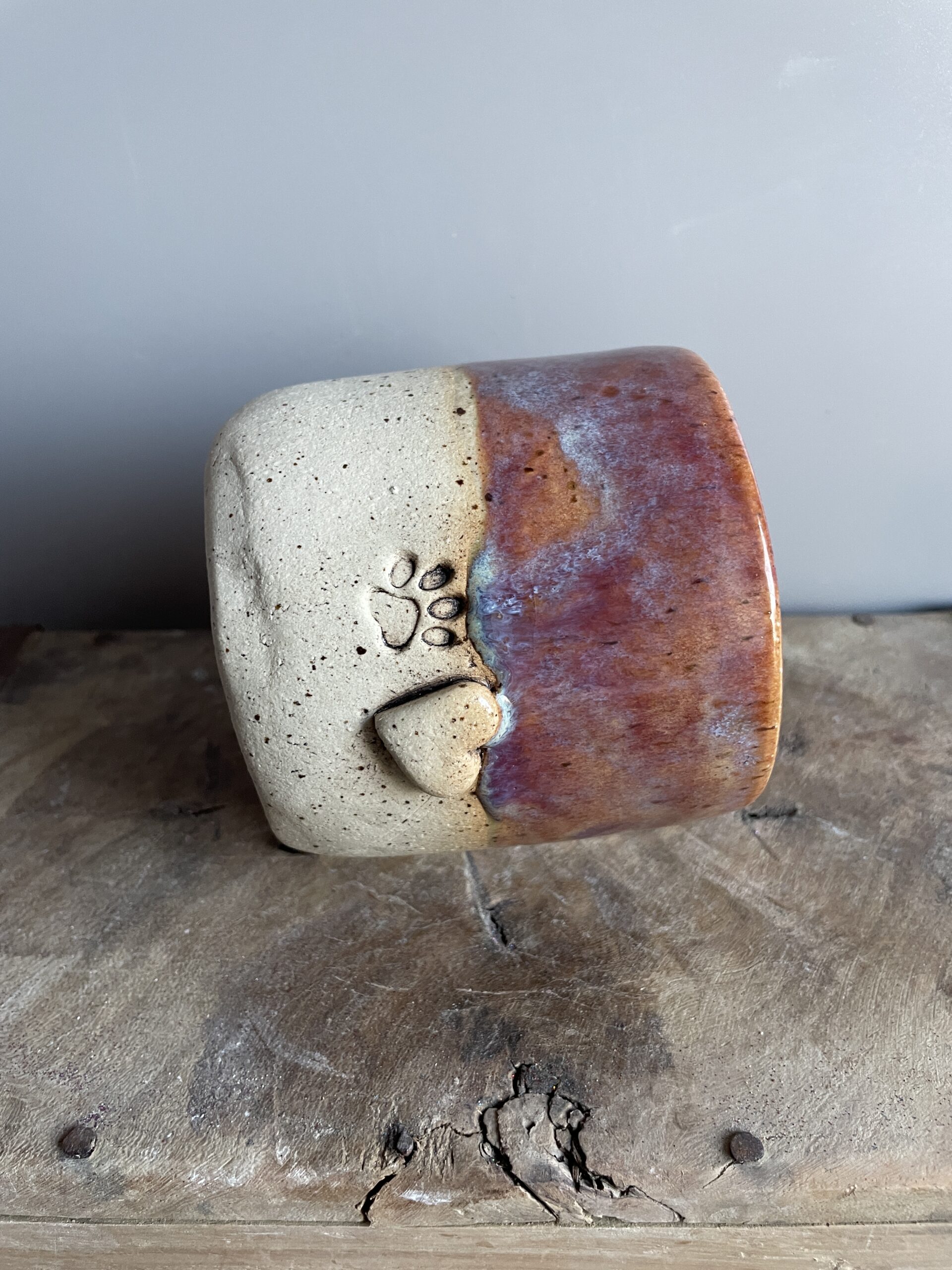 Der Pfotenbecher begeistert mit einer sanften Roséfarbe, die mit einem feinen Hauch von Blau schimmert – eine elegante Kombination, die Wärme und Geborgenheit ausstrahlt. Jeder Becher ist ein Unikat, da die Glasur in einem individuellen Farbspiel verläuft und so für eine einzigartige Optik sorgt.
