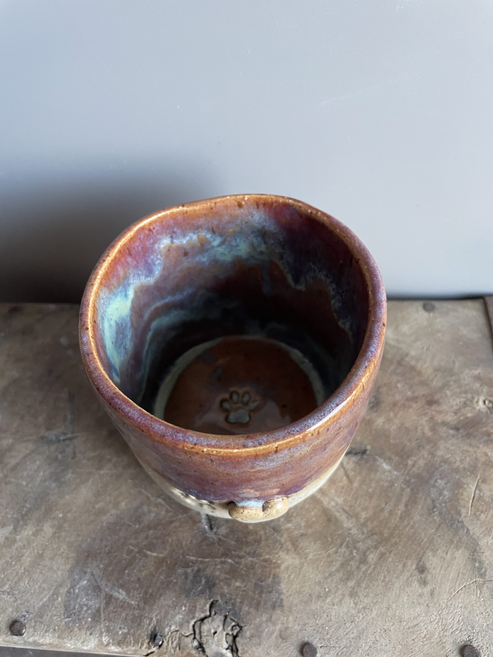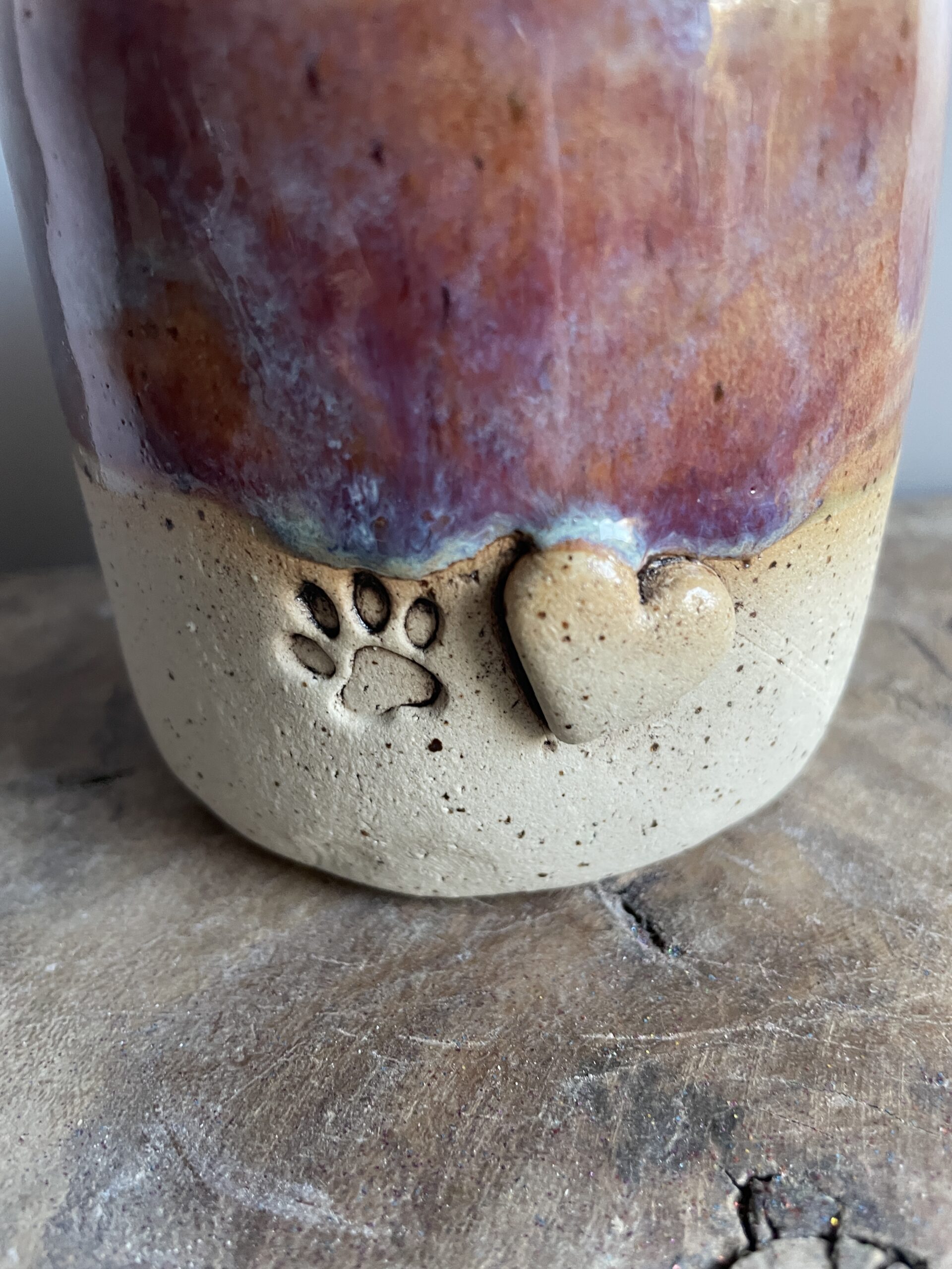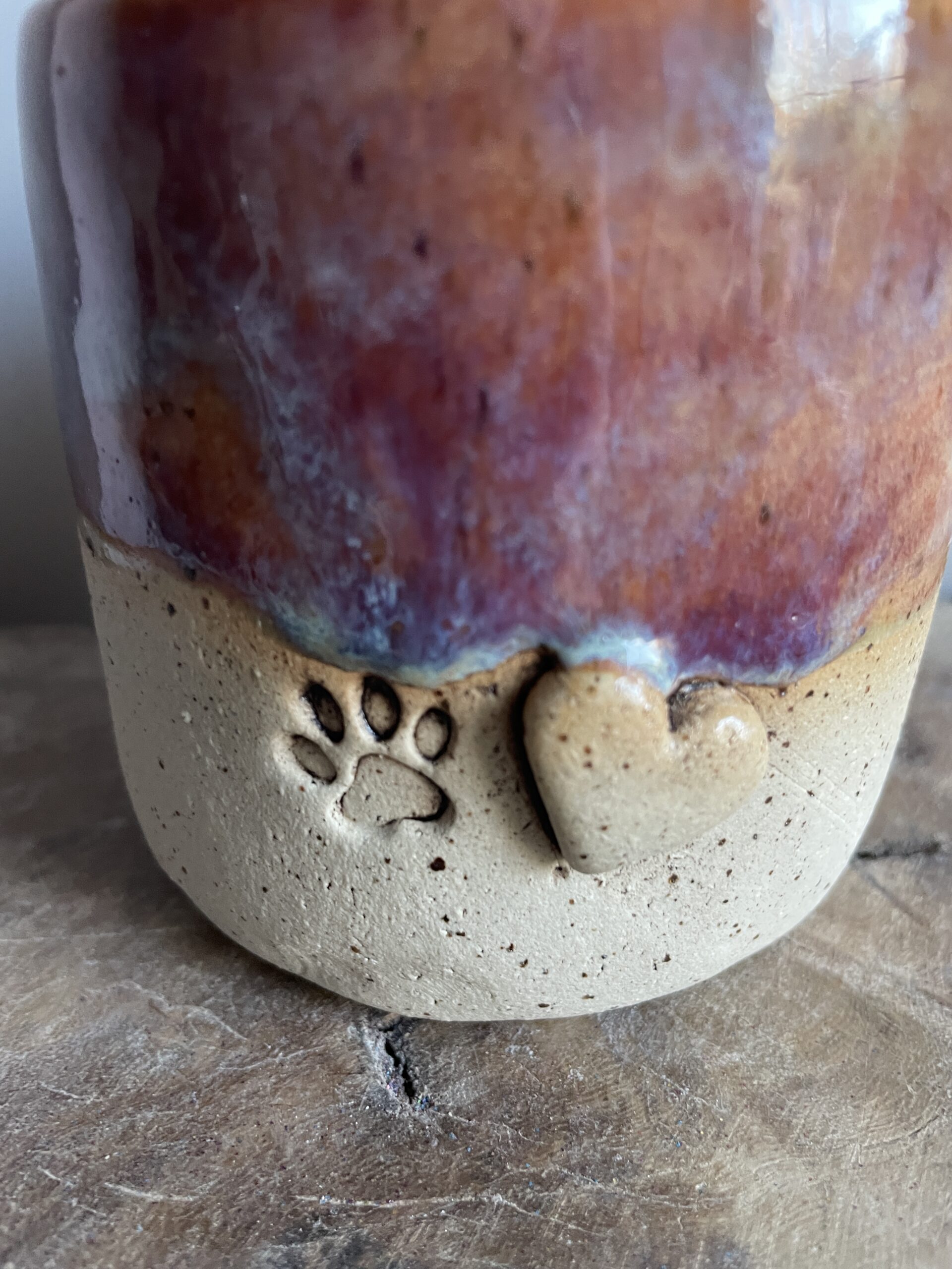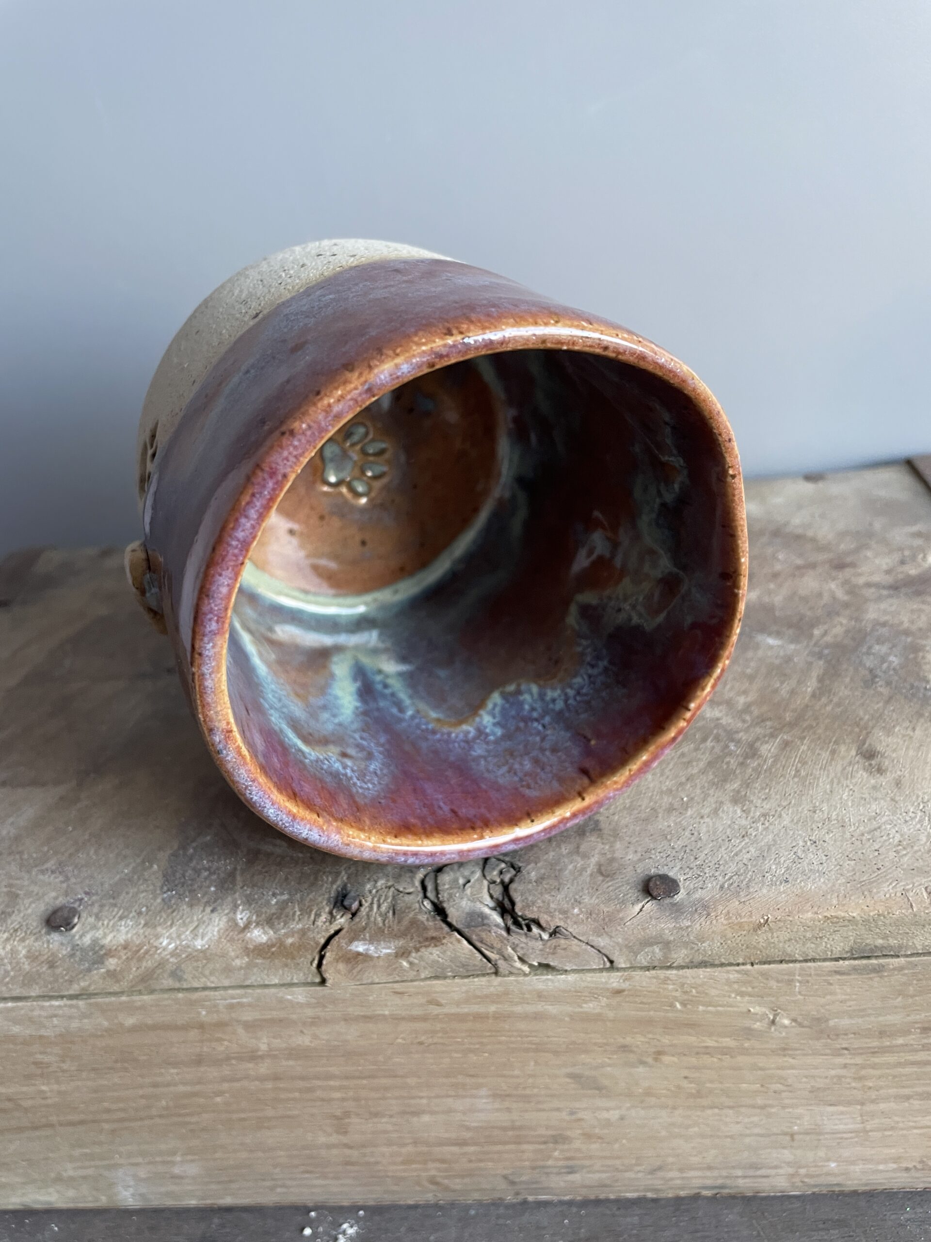 Der Pfotenbecher begeistert mit einer sanften Roséfarbe, die mit einem feinen Hauch von Blau schimmert – eine elegante Kombination, die Wärme und Geborgenheit ausstrahlt. Jeder Becher ist ein Unikat, da die Glasur in einem individuellen Farbspiel verläuft und so für eine einzigartige Optik sorgt.