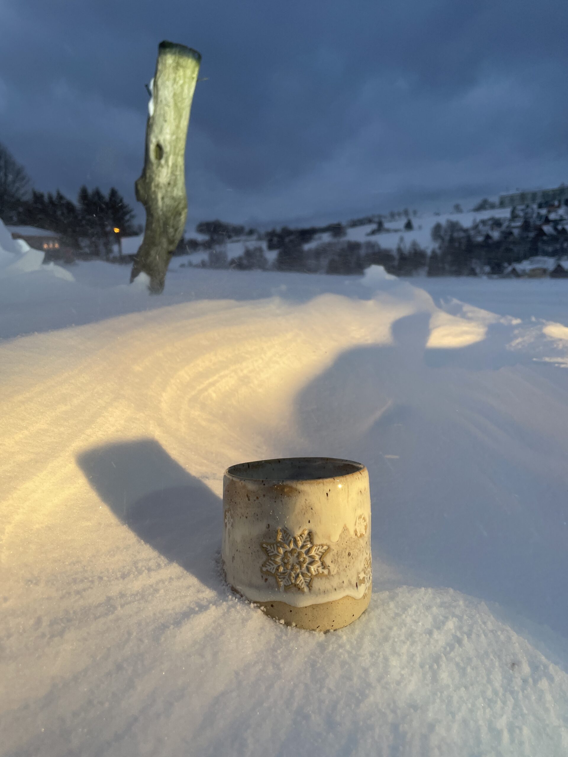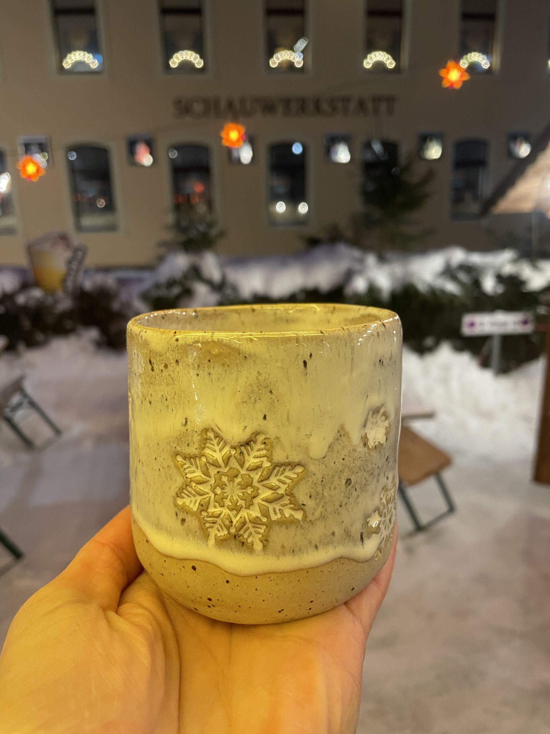 Draußen tanzen die ersten Schneeflocken Winter Tasse mit Schneeflocken– still und magisch, jede einzigartig, genau wie deine besonderen Wintermomente. Stell dir vor, du sitzt eingekuschelt mit einer warmen Decke, in der Hand eine Tasse dampfenden Tees. In deinen Händen hältst du unsere handgemachte Schneeflocken-Tasse – zart verziert mit dem Muster des Winters, das so vergänglich und schön ist wie der erste Schnee.